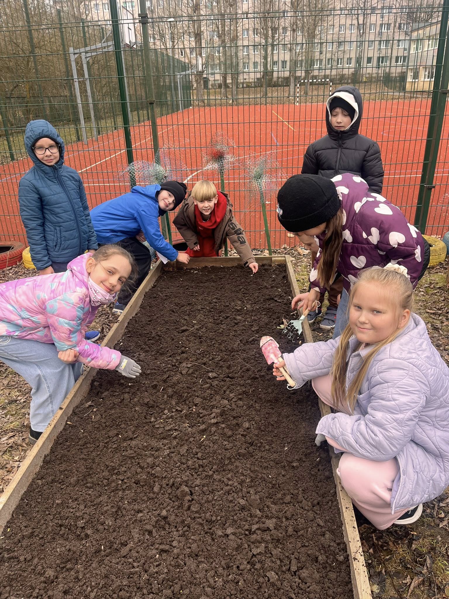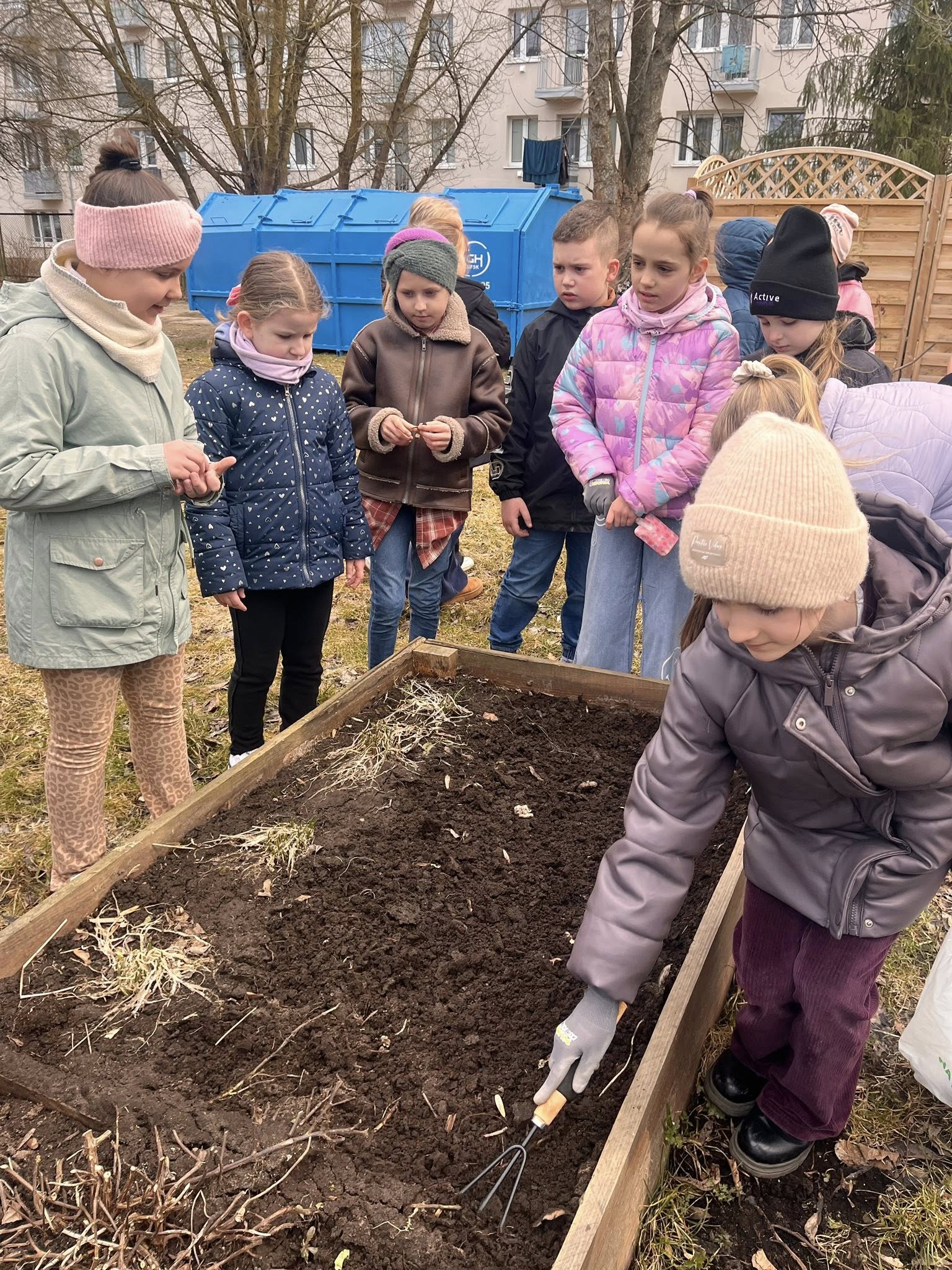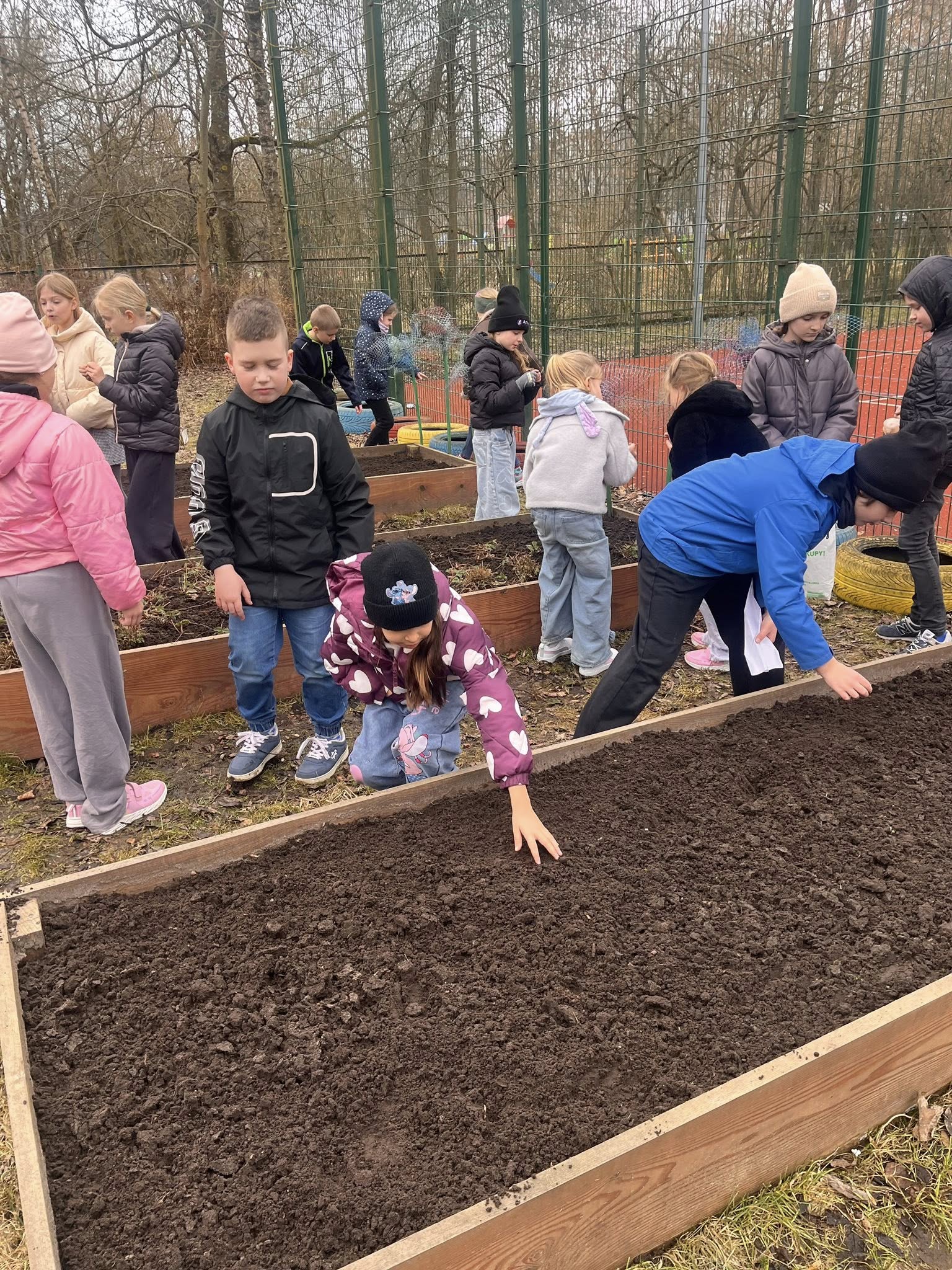 W ramach innowacji pedagogicznej „Kolorowy ogródek - sztuka i natura w jednym” klasa 2b odwiedziła szkolny ogród, aby przygotować go na nadchodzącą wiosnę.