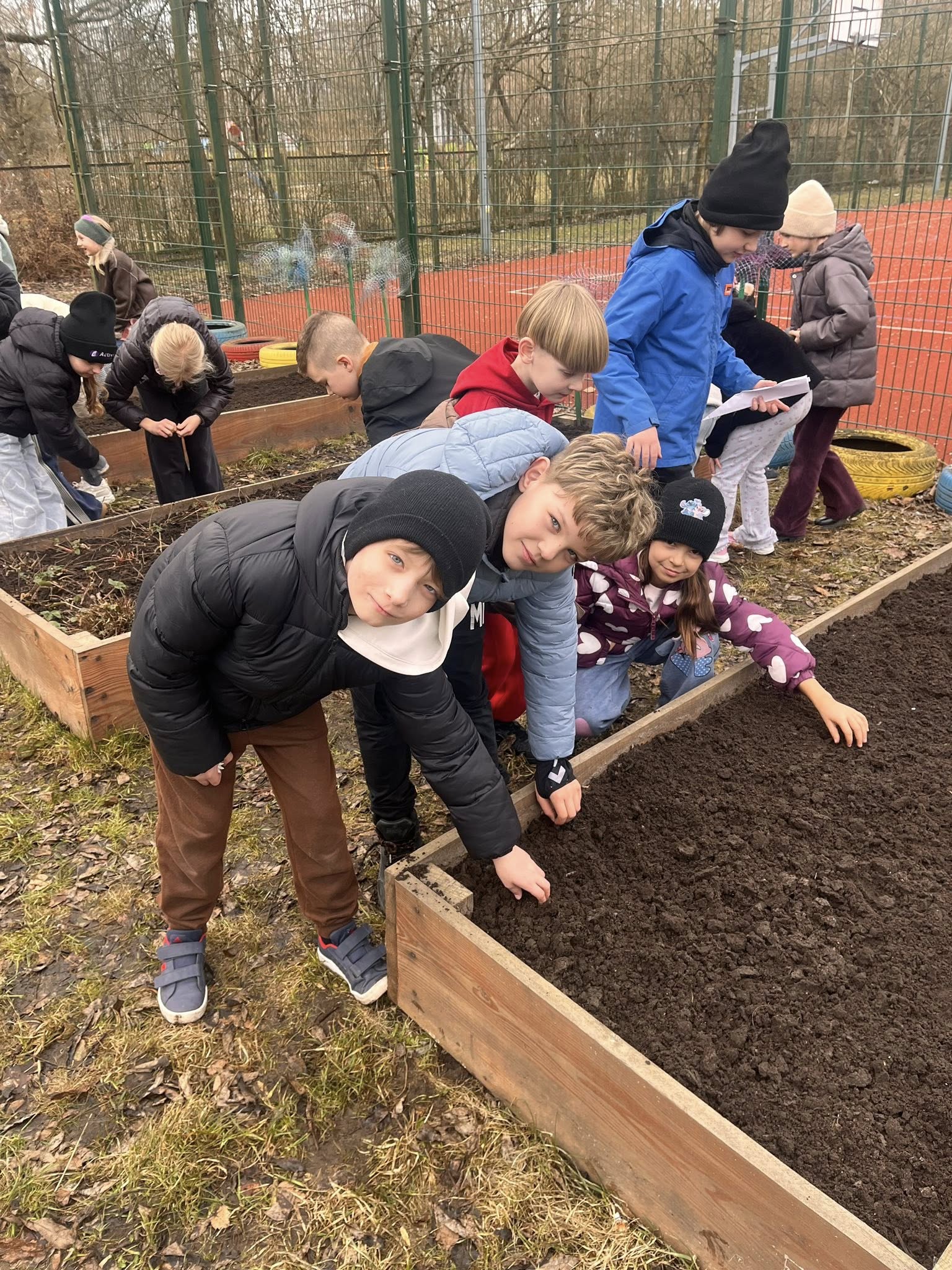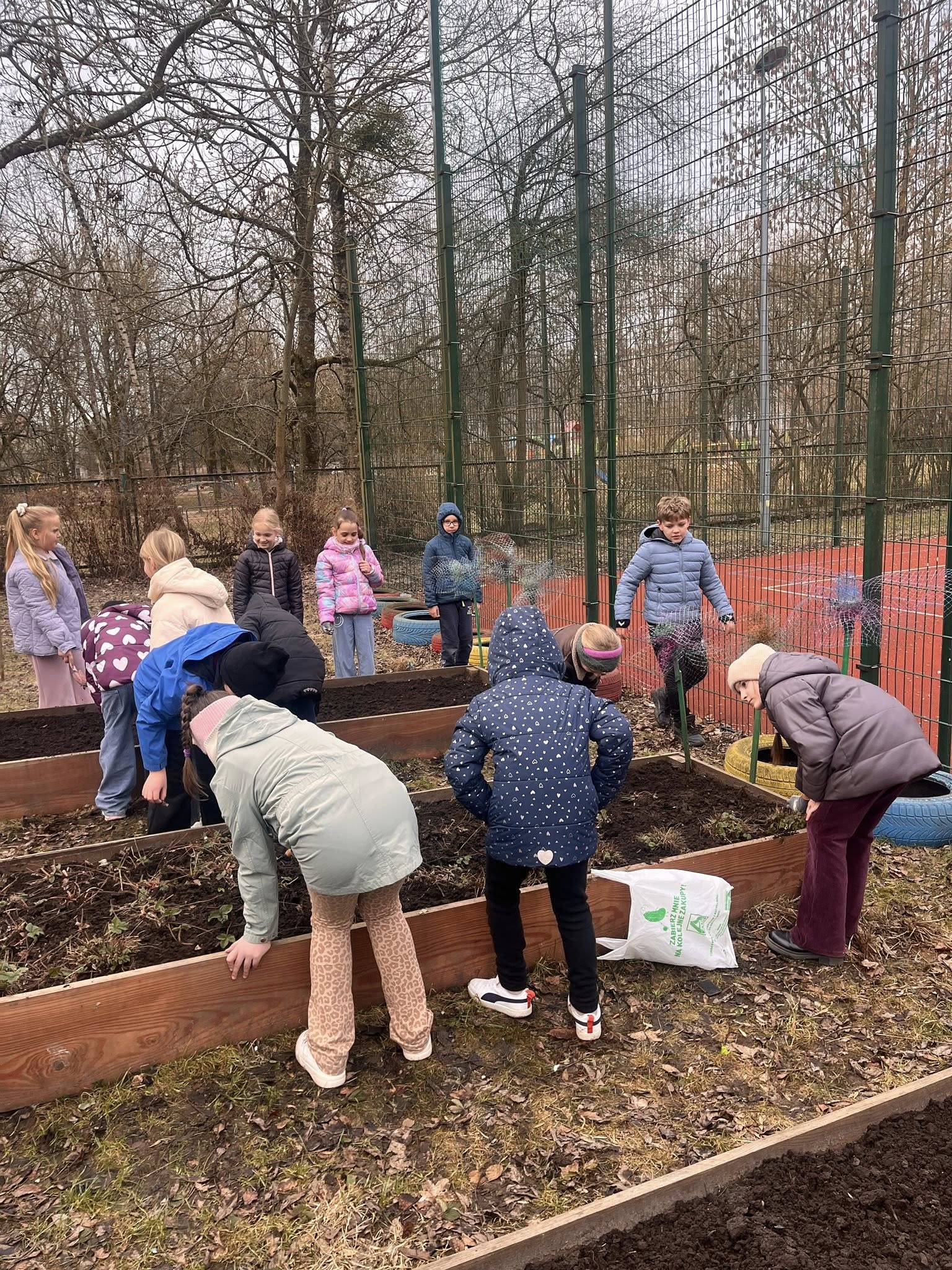 W ramach innowacji pedagogicznej „Kolorowy ogródek - sztuka i natura w jednym” klasa 2b odwiedziła szkolny ogród, aby przygotować go na nadchodzącą wiosnę.