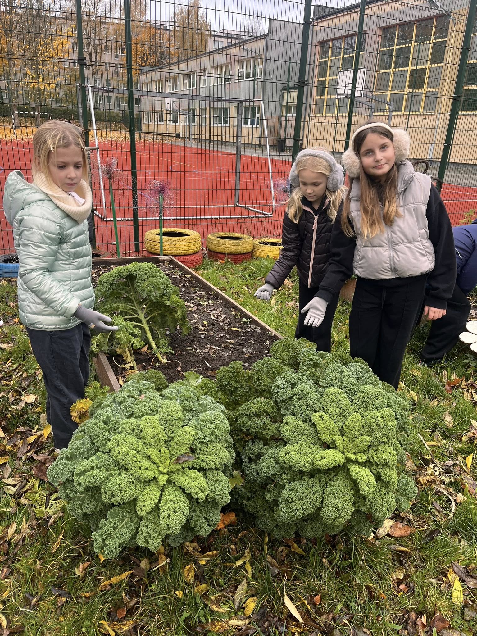 Uczniowie klasy 2b, biorący udział w innowacji pedagogicznej „Kolorowy ogródek – natura i sztuka w jednym”, spędzili czas w szkolnym ogrodzie, porządkując go na zimę.
