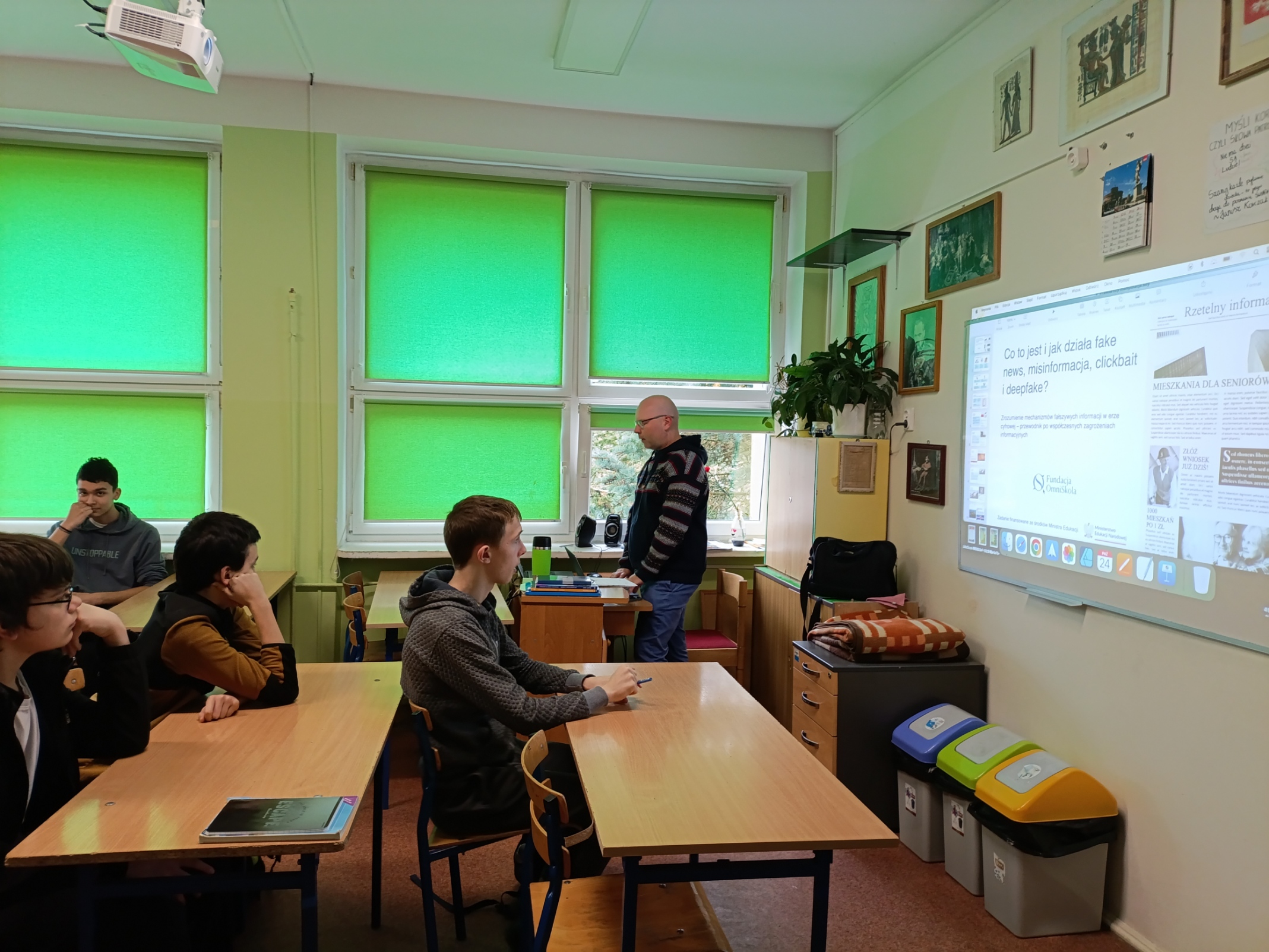 W dniu 24 października uczniowie klas ósmych mieli okazję odbyć godzinne szkolenie z panem Kamilem Wiśniewskim z fundacji zajmującej się bezpiecznym korzystaniem z Internetu, a właściwie z mediów społecznościowych. Młodzi ludzie żyją dziś na pograniczu świata rzeczywistego, a tego wykreowanego w środkach masowego przekazu. Dzięki tym zajęciom dowiedzieli się jak weryfikować informacje dostępne w sieci? Na co zwracać uwagę, aby mieć pewność, że newsy, które do nich docierają, są prawdziwe. Możliwości jakie daje dziś korzystanie ze sztucznej inteligencji są niesamowite. Jednakże trzeba pamiętać, że nie każdy używa AI w dobrych celach. W mediach pojawiają się często przekazy informacji odbiegające dalece od rzeczywistości, a ich weryfikacja staje się coraz trudniejsza. Czy potrafimy sobie z tym poradzić? Czy staniemy się zakładnikami mediów? Warto zadawać sobie takie pytania. To szkolenie trafiało w sedno problemu i w moim mniemaniu, należałoby je powtarzać co kilka miesięcy.